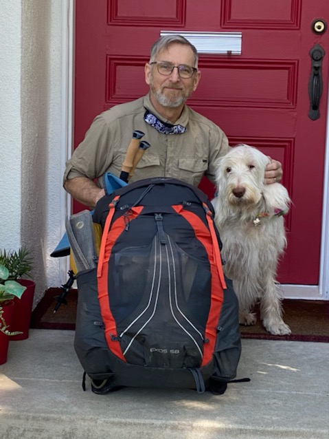Above, you’ll find a picture Marta took of me with my gear and with Mochi, our dog, in front of our house in Hanford before we got in the car to drive to the trailhead at Walker Pass, east of Bakersfield. (No, Mochi isn’t hiking with me.)