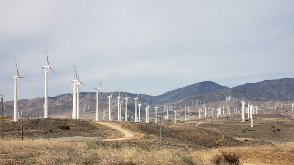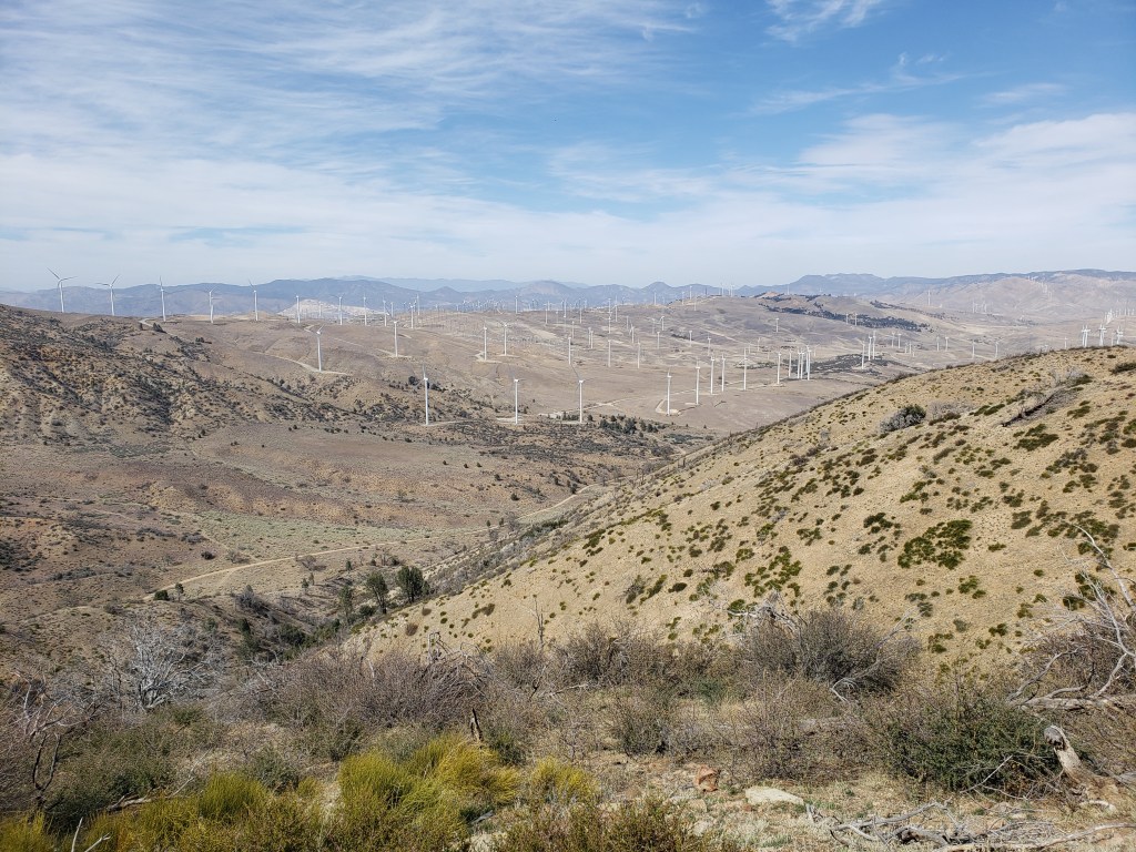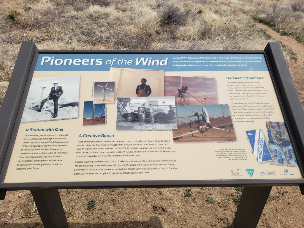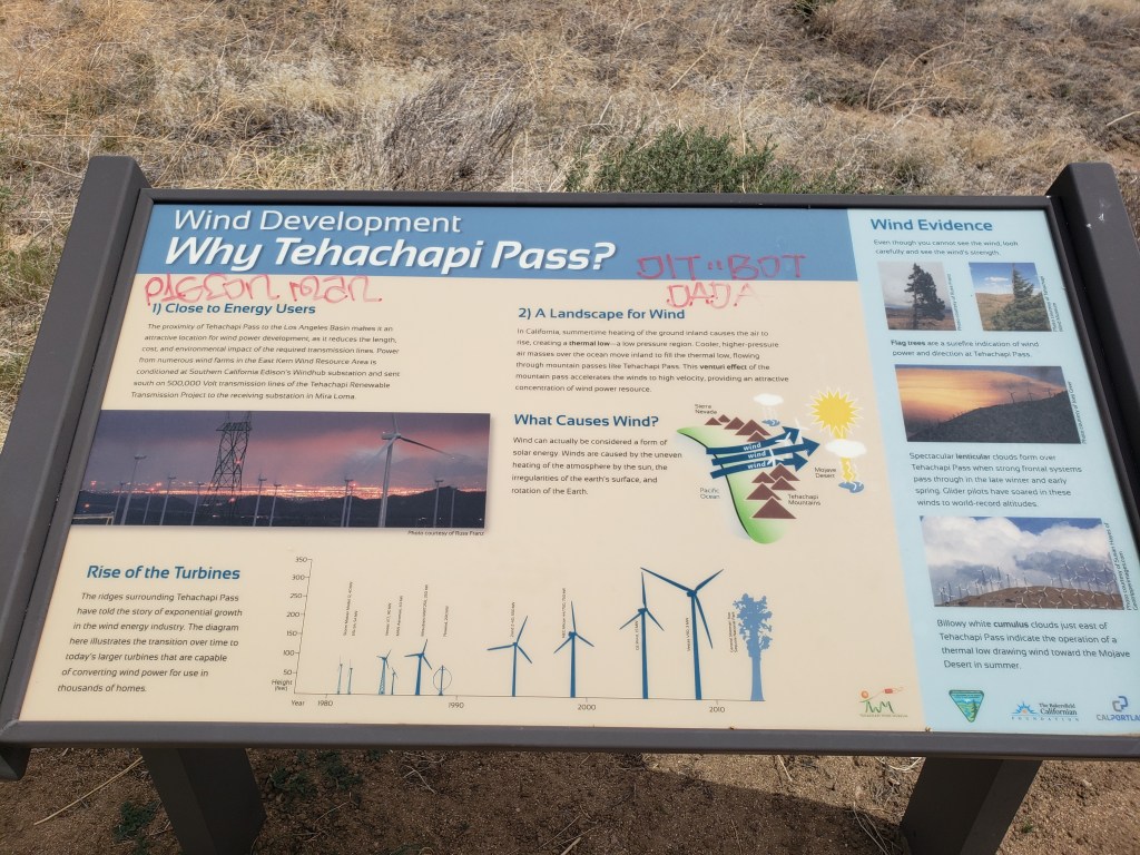 I’ve previously written about the wind turbines at Tehachapi. That includes turbines on both sides of Tehachapi Pass as well as turbines north and south of Tehachapi along the ridge of the Tehachapi Mountains. The ones north of Tehachapi are on the west side of the ridge. The turbines south of Tehachapi are on the east side of the ridge. Here are some photos, including pictures of a wind turbine exhibit where the PCT crosses a road near Tehachapi.