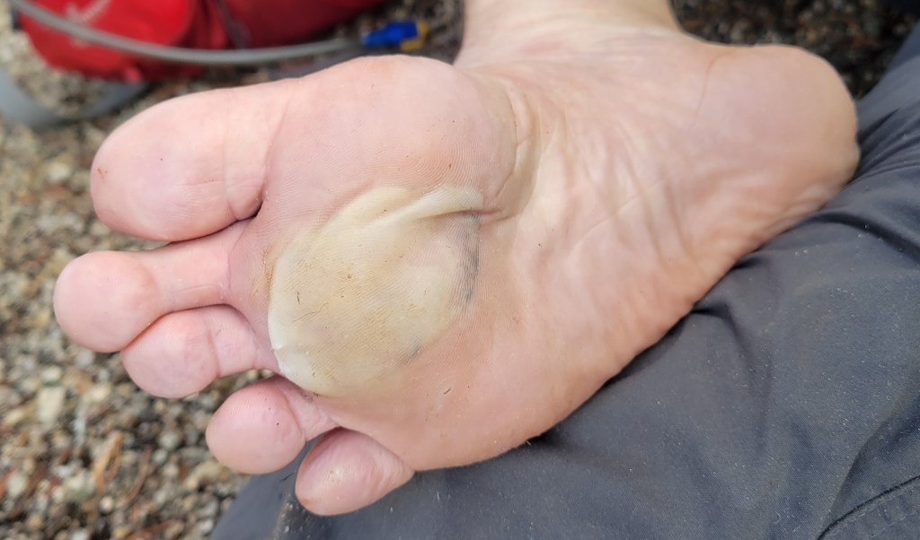 I had never before thought about the impact of my shoe lift. But it’s true that at the start of many hikes I will get a much smaller blister on my right foot before it has a chance to toughen up. A blister of perhaps 1 inch by 1/2 inch. The blister above is 1-1/4 inches by 2 inches. I don’t tend to get blisters on my left foot.
