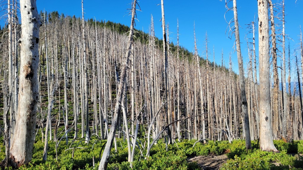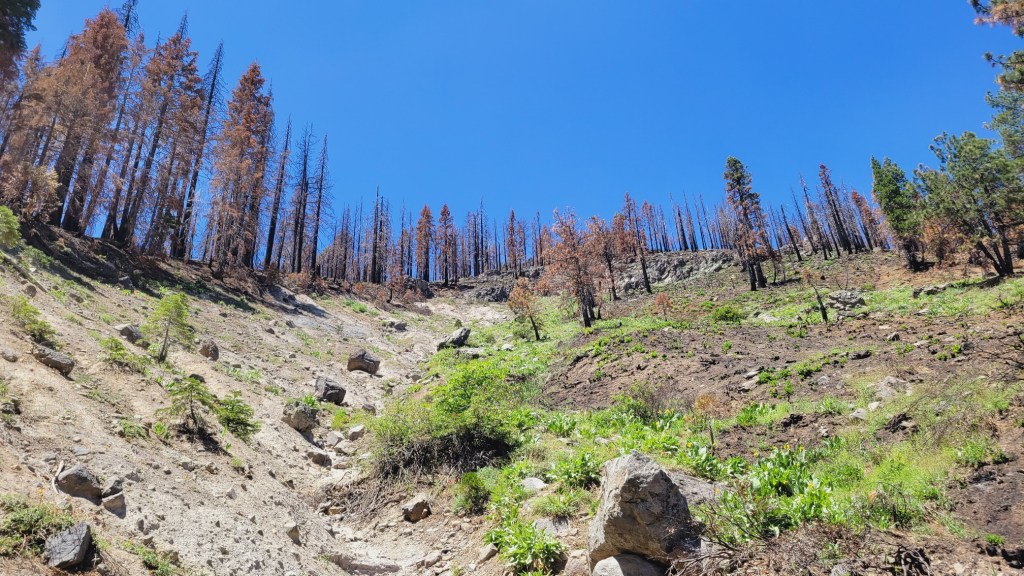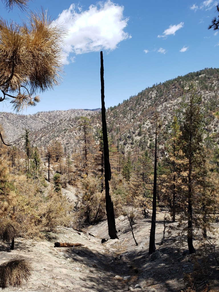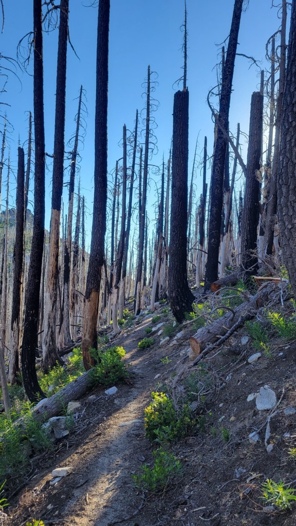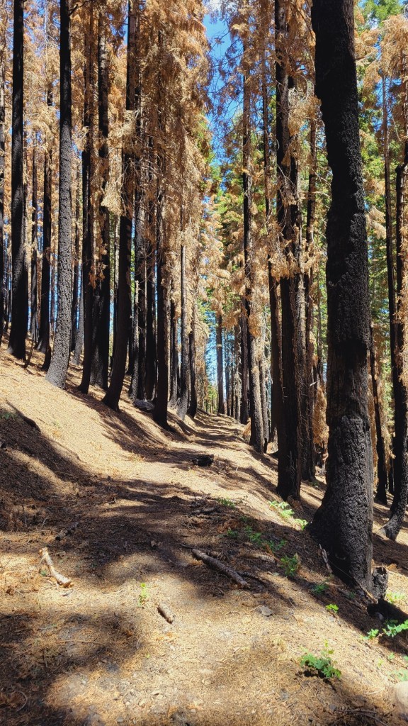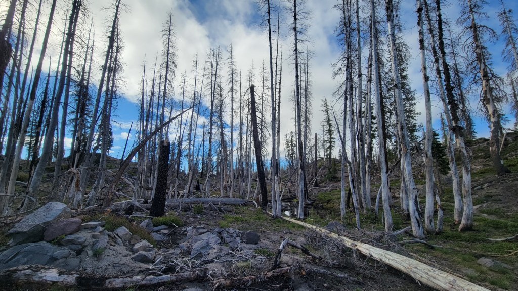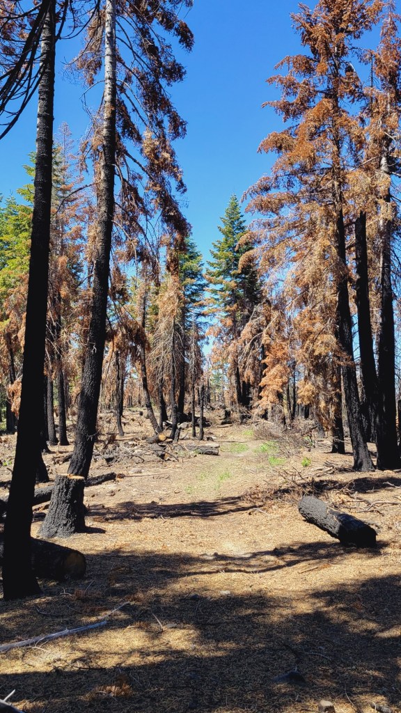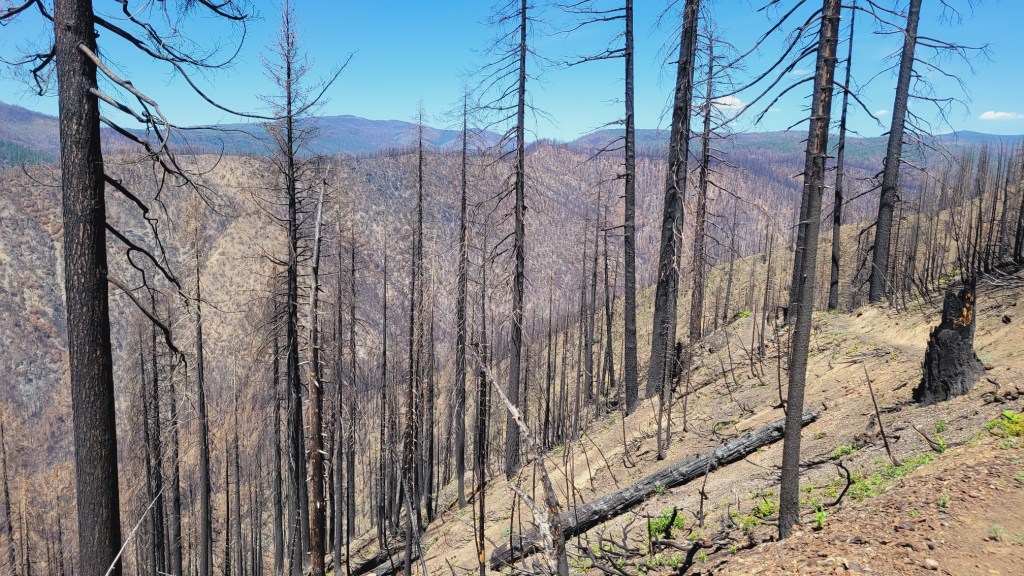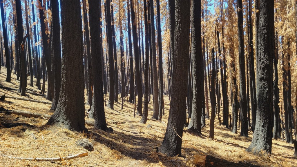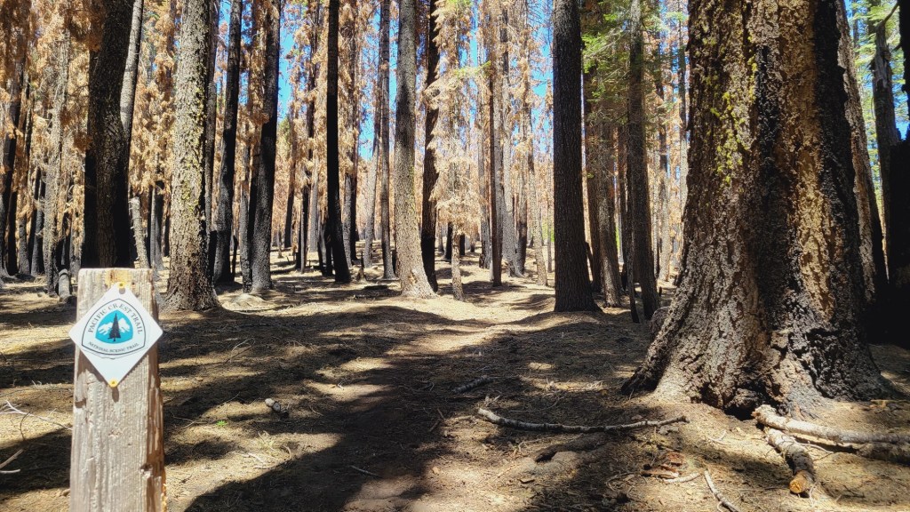 I’ve been passing through more fire zones in far Northern California and Southern Oregon. At least a part of every day over the past 10 days has been spent walking through cathedrals of burnt trees. In addition, there have been numerous active fires visible from the trail.