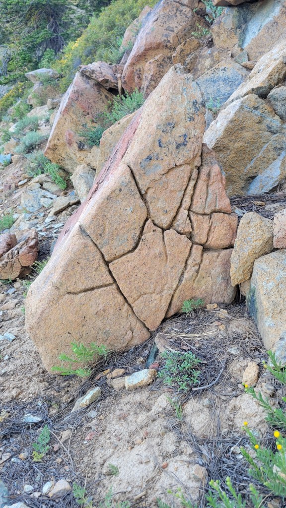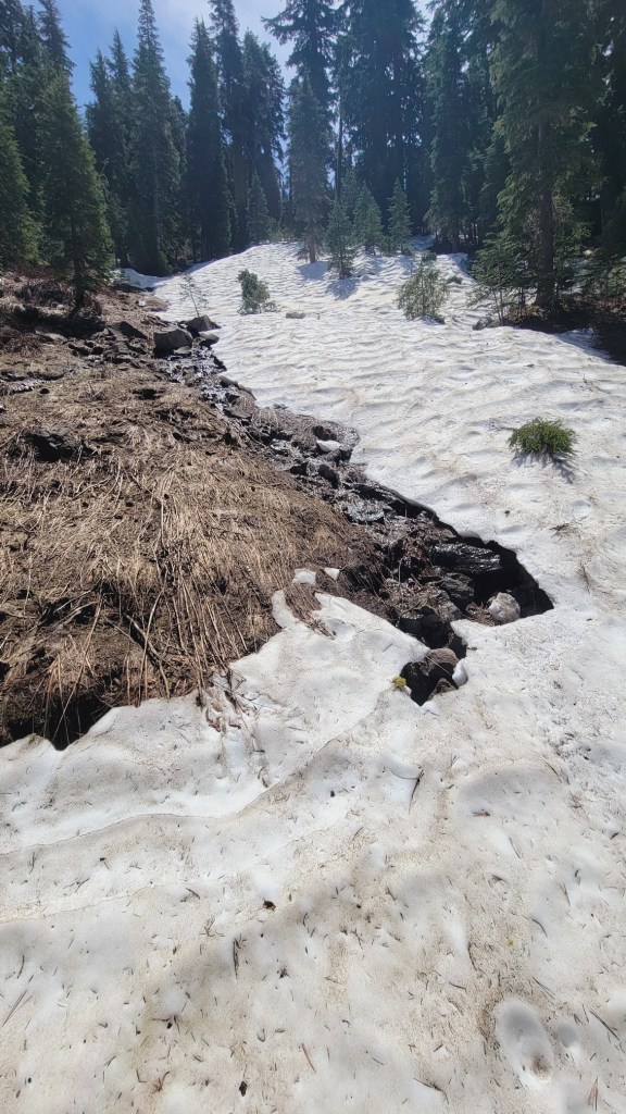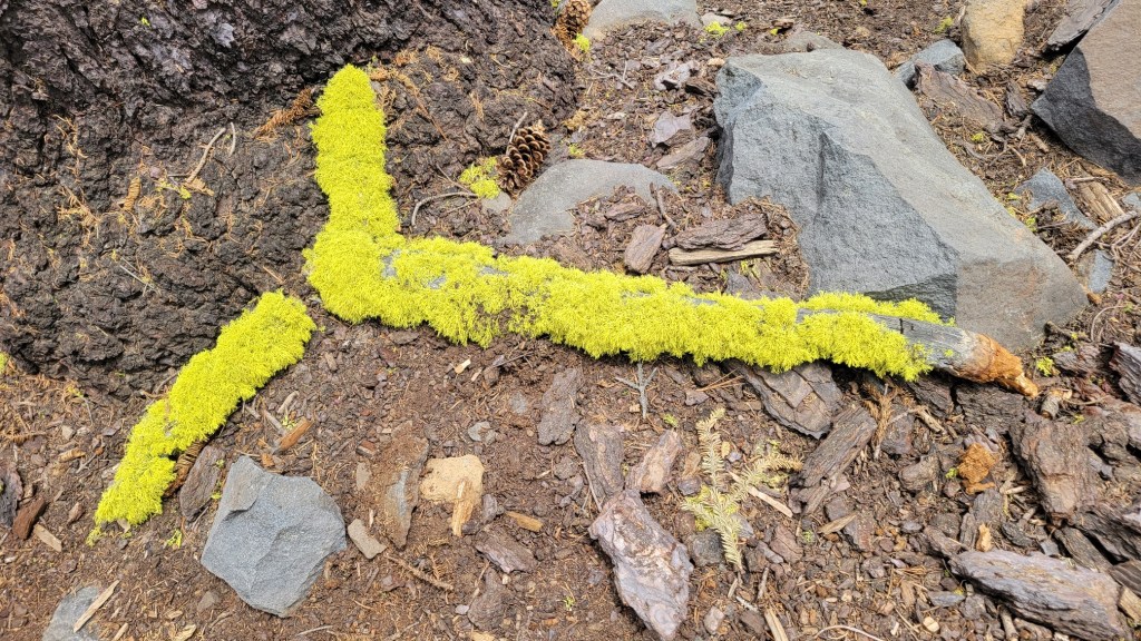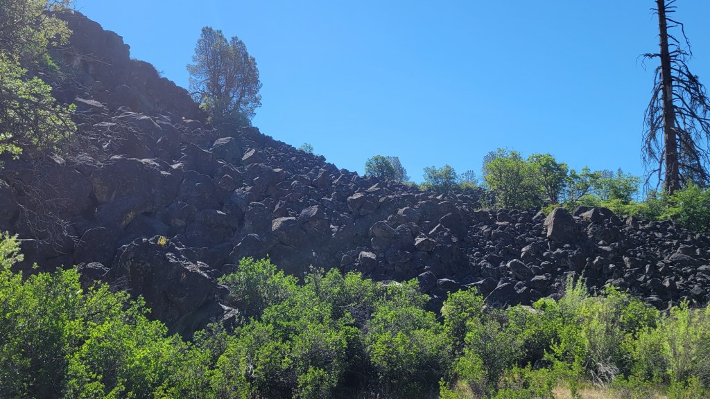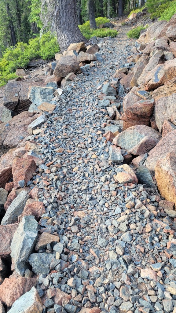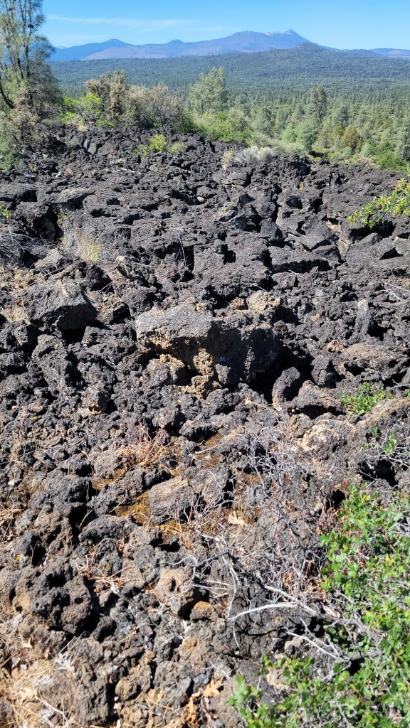 In the Cascade Mountains of Oregon, there are places where the PCT travels through old lava flows. This is particularly the case north of the Three Sisters. It’s extremely tiring to walk on the loose, unstable lava rock. Very hard on the feet, too. I can’t imagine how hard it was to build the trail through here.